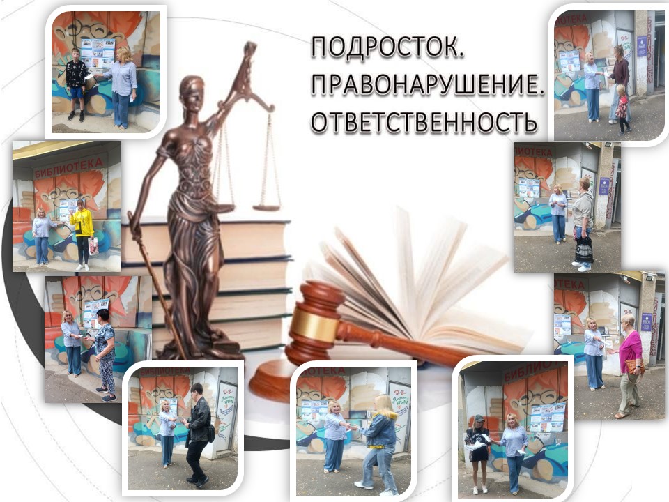 Сотрудник библиотеки - филиала №23 им. И. Л. Сельвинского в рамках акции вручала жителям информационные буклеты «Профилактика правонарушений среди детей и подростков». В буклете изложены рекомендации модели поведения в критических ситуациях, о самых частых и распространенных правонарушениях в молодежной среде, уголовная и административная ответственность подростков и их родителей, виды ответственности и наказания, как и каким образом можно избежать печальных последствий.